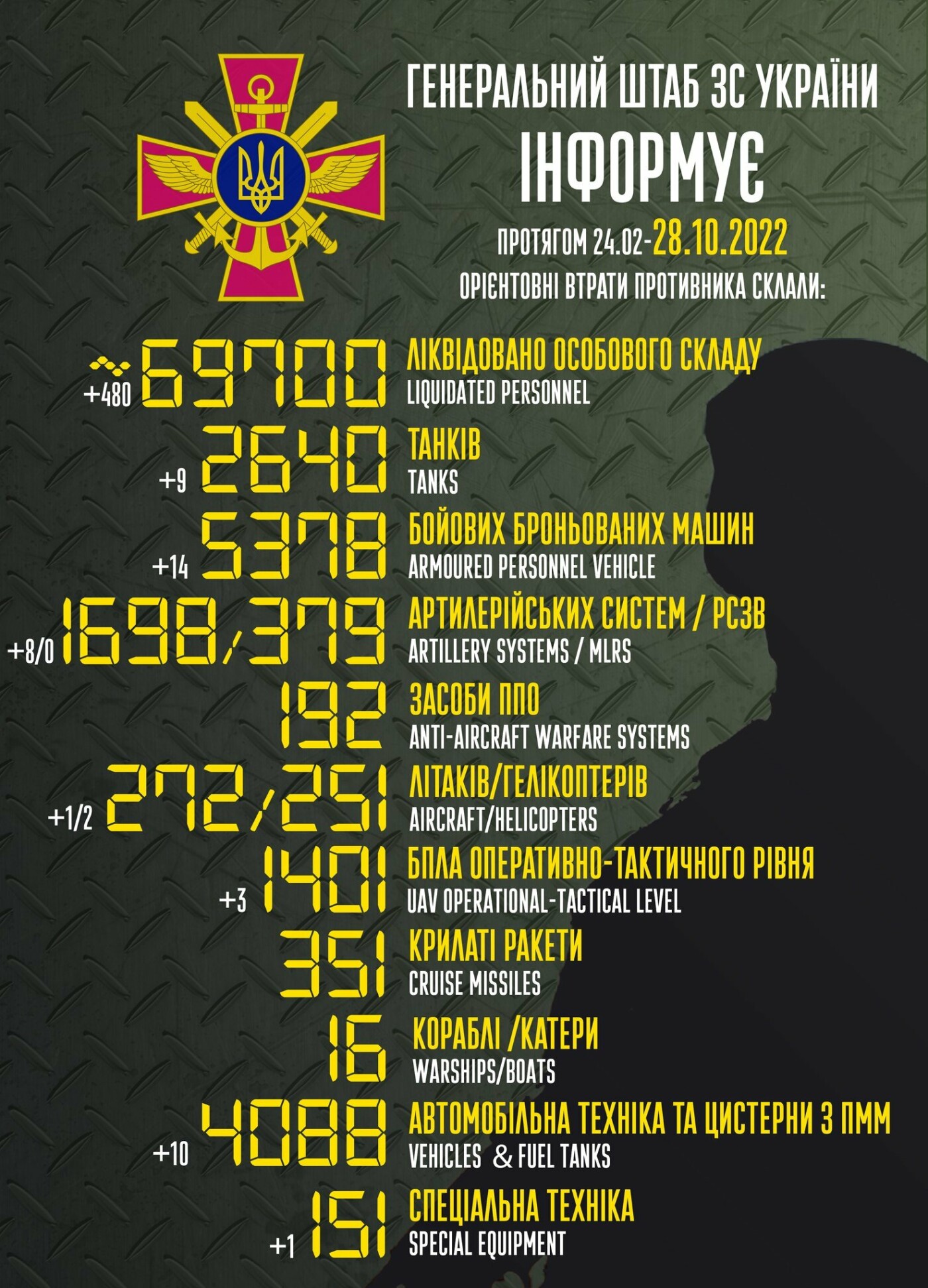 За добу українські військові знищили близько 650 одиниць особового складу армії російського агресора, 9 танків, 11 бойових броньованих машин, 15 БПЛА оперативно-тактичного рівня, повідомляє Генеральний штаб ЗСУ. for-ua.com »