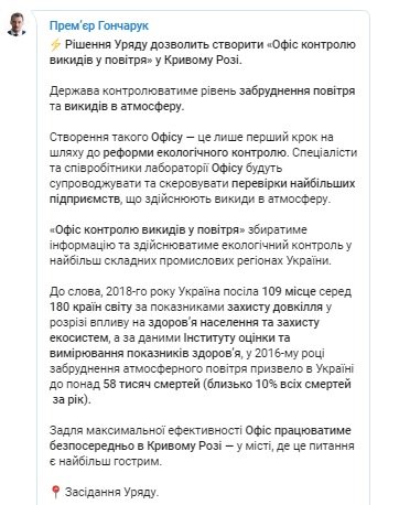 Кабмин намерен создать в Кривом Роге Офис контроля выбросов в атмосферу