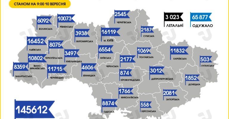 В Украине по состоянию на 10 сентября зафиксировано 145 612 случаев коронавирусной болезни COVID-19 06239.com.ua »