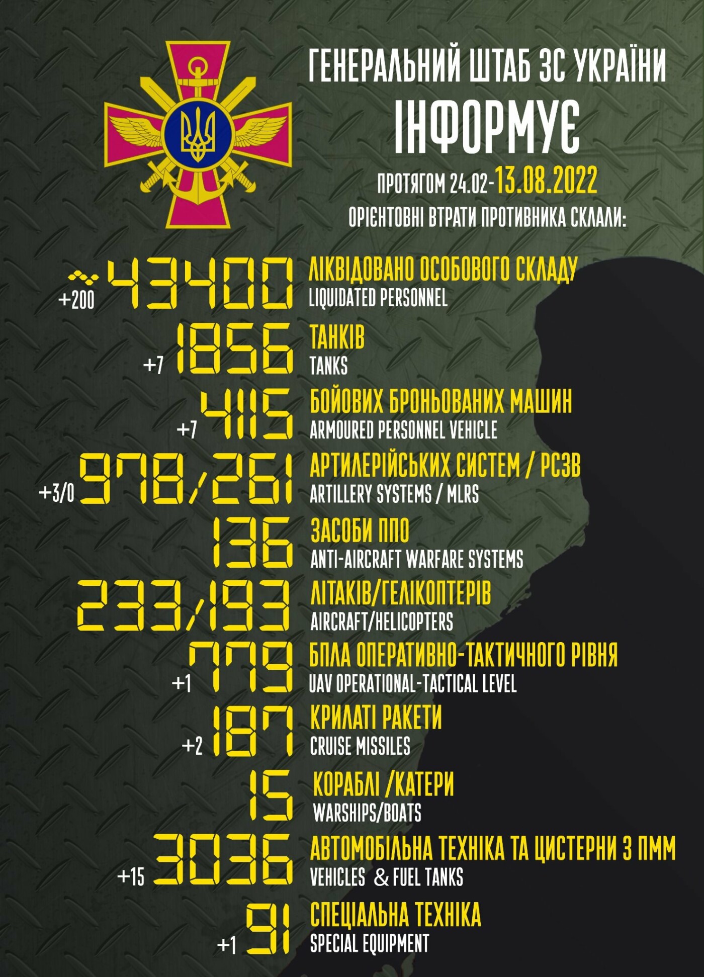 За сутки 18 августа украинские защитники уничтожили около 400 российских оккупантов, общее число потерь РФ в войне против Украины за период с 24 февраля достигло примерно 44 700. Об этом в Facebook сообщил Генеральный штаб Вооруженных сил Украины. gordonua.com »