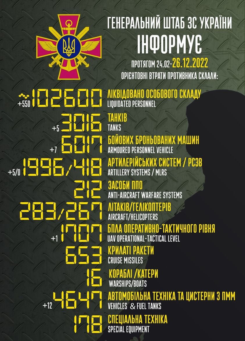 Общие боевые потери РФ с начала войны – около 149 240 человек (+550 за сутки), 3388 танков, 2383 артсистемы, 6630 бронированных машин. ИНФОГРАФИКА