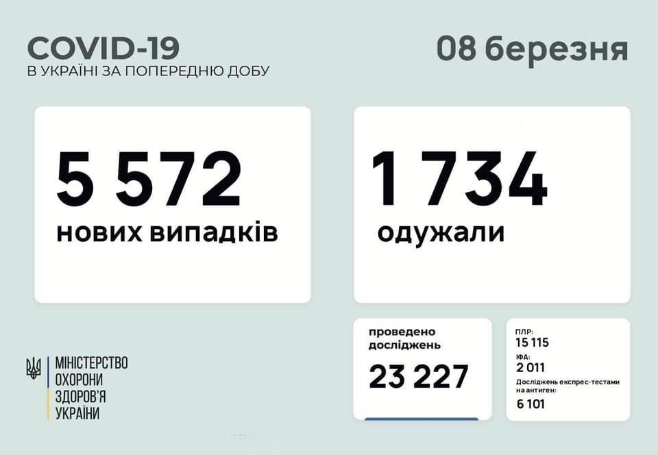 В Украине за минувшие сутки, 7 марта, зафиксировали 5572 новых случая COVID-19. Об этом в "Фейсбуке" сообщил министр здравоохранения Максим Степанов. news.yandex.ua »