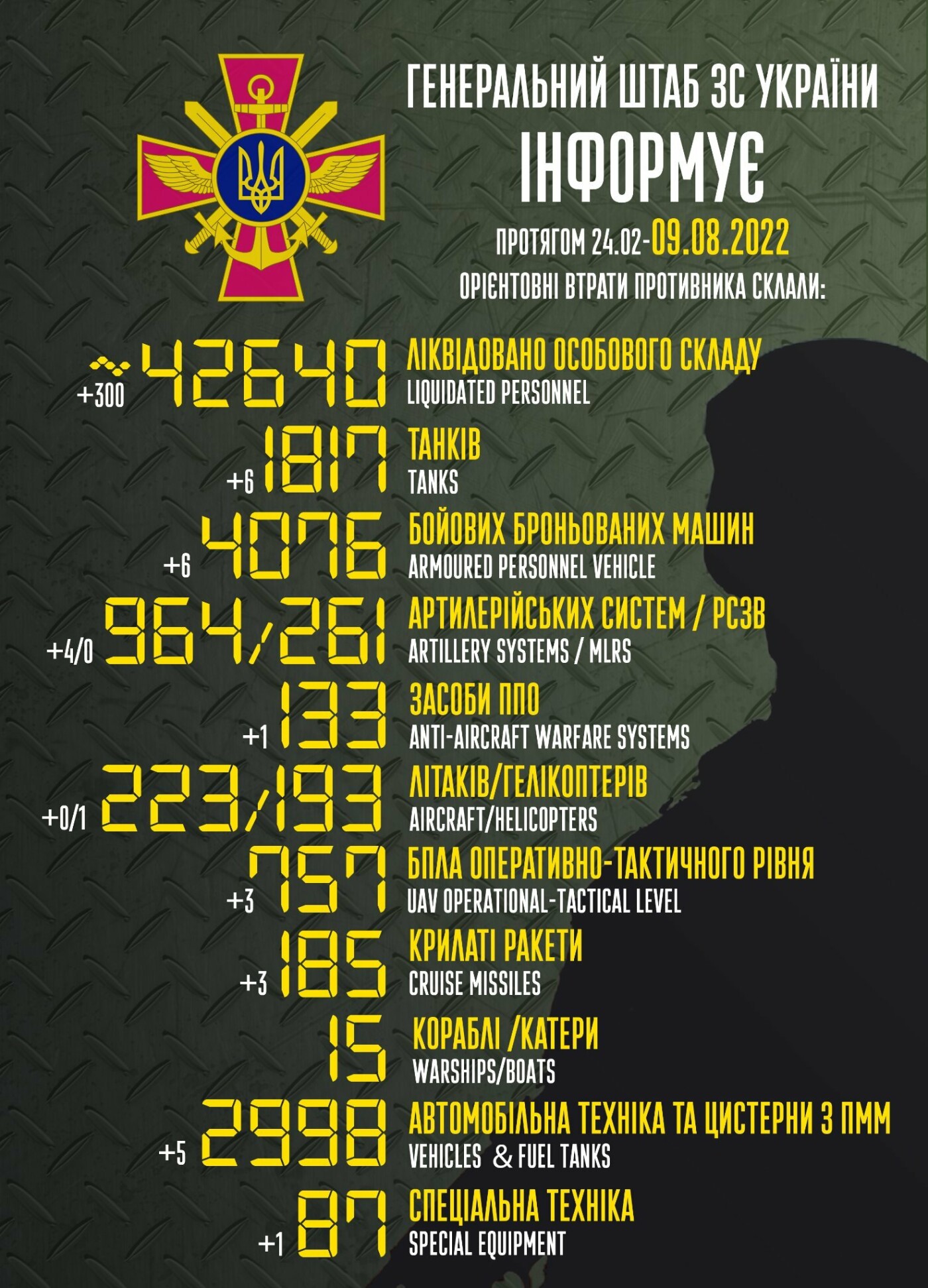 КИЇВ. 9 серпня. УНН. Втрати російських окупантів, з початку повномасштабного вторгнення рф, в Україні сягнули вже близько 42 640 осіб, 1817 танків, 193 гелікоптерів та сотень одиниць військової техніки, повідомили у Генеральному штабі ЗСУ, пише УНН. unn.com.ua »
