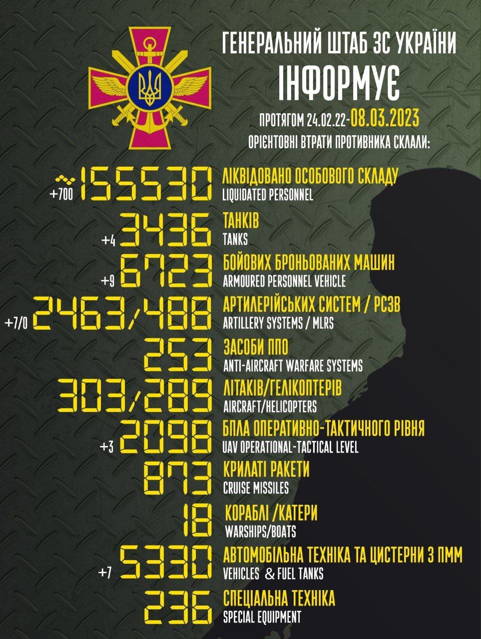 По состоянию на утро 8 марта 2023 года потери российских оккупантов составляют примерно 155 530 человек. censor.net »
