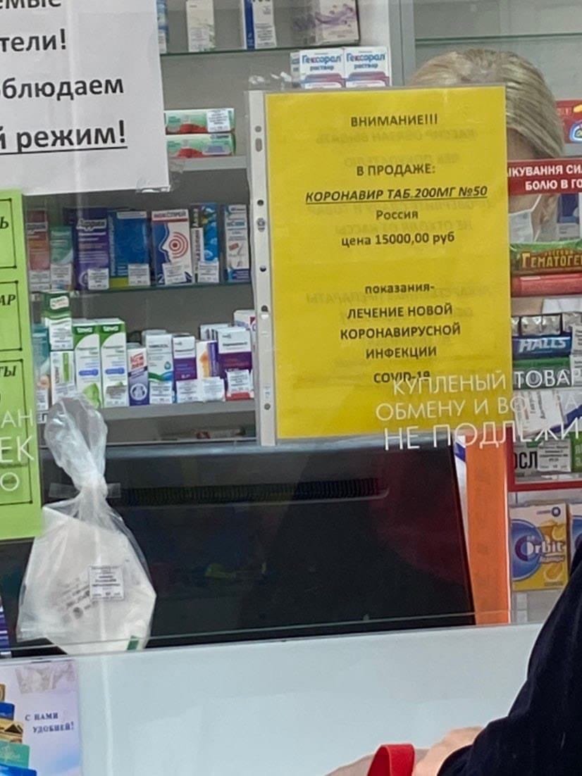 В донецкой аптеке «Народная» рекламируются российские таблетки «коронавир» стоимостью в 15 тысяч российских рублей. Утверждается, что лечат «коронавирусную инфекцию» 62.ua »
