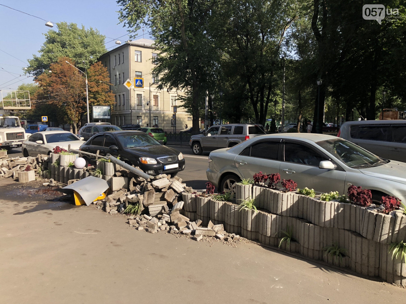 В результате аварии повреждено бетонное ограждение и снесен дорожный знак. 057.ua »