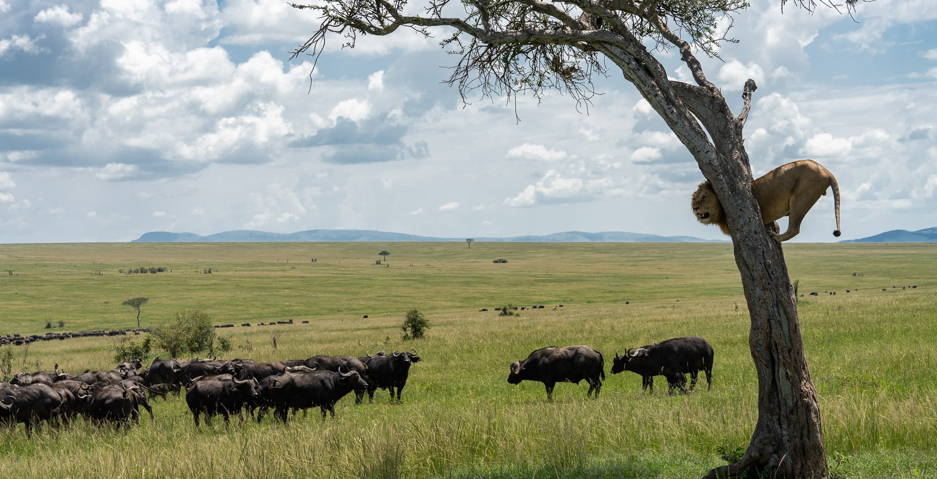Лев просидел на дереве около часа, пока буйволы не успокоились и не убрались восвояси. focus.ua »