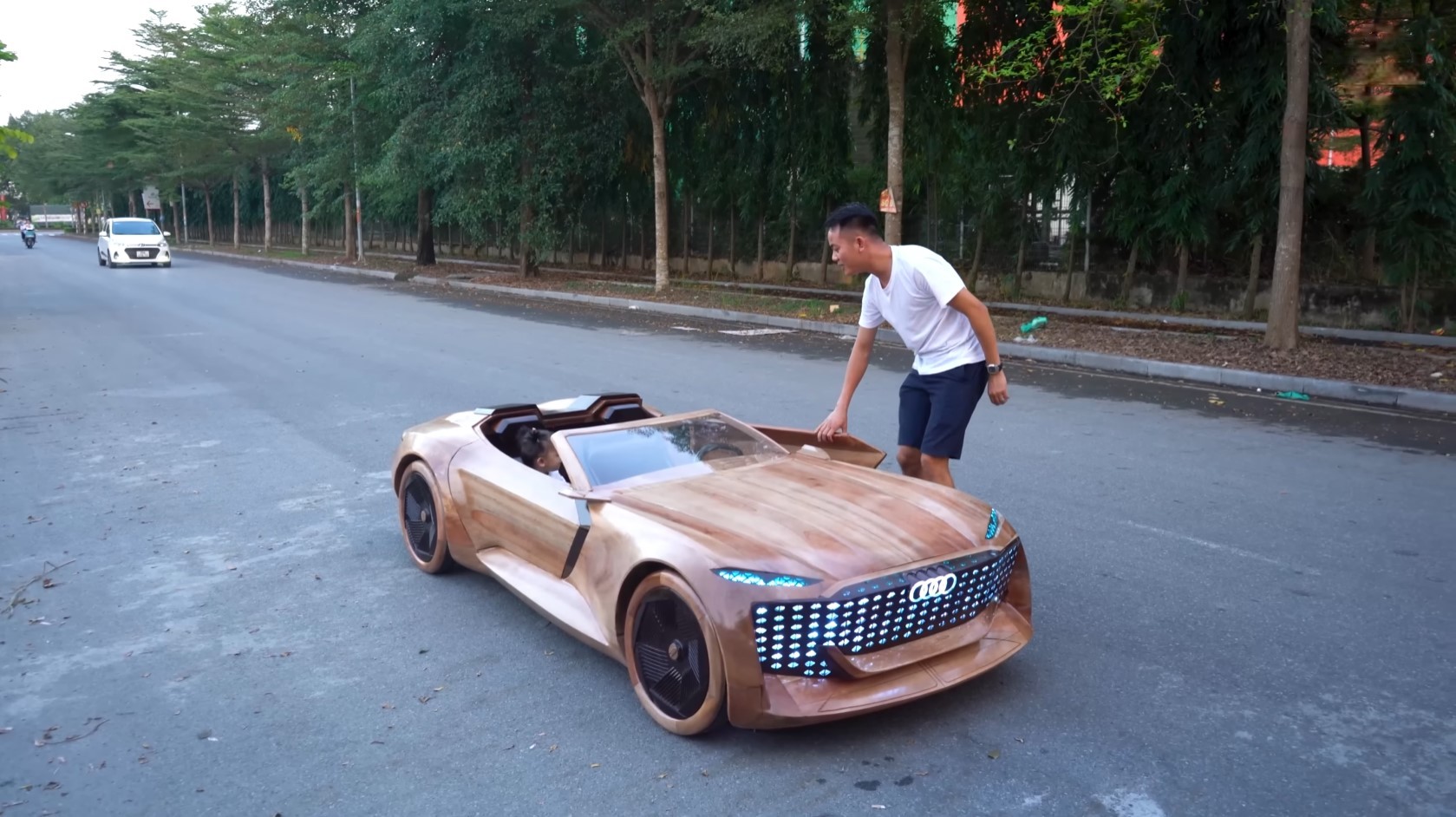 На деревянном Audi Skysphere можно ездить благодаря электромотору. Светотехника, двери и багажник работают почти также, как и на оригинальном концепте. focus.ua »