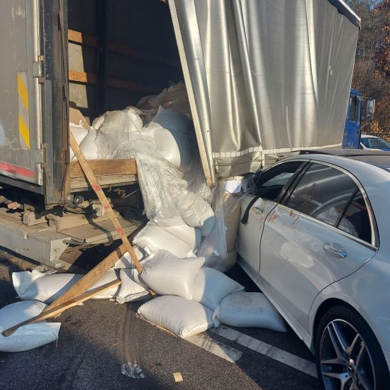Во время торможения закрепленные в прицепе глыбы сдвинулись на кабину грузовика. ru.tsn.ua »