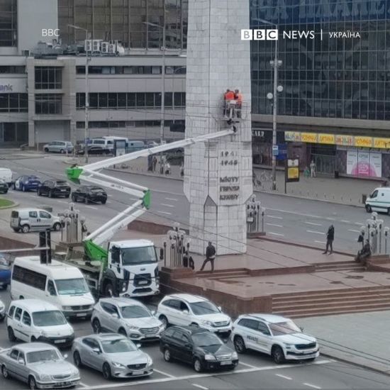 Коммунальщики снимают последний элемент советской символики с обелиска в честь города-героя Киева. 15 сентября уже убрали звезды на боковых сторонах обелиска и аннотационную доску на русском языке. censor.net »