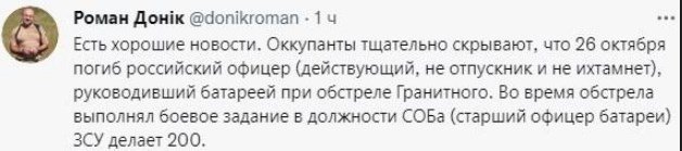 В районе проведения операции Объединенных сил на Донбассе был ликвидирован действующий российский офицер. Об этом сообщил в Facebook волонтер Роман Доник. «Оккупанты тщательно скрывают, что 26 октября погиб российский офицер (действующий, не отпускник и не ихтамнет), руководивший батареей при обстреле Гранитного», — написал он. inforesist.org »