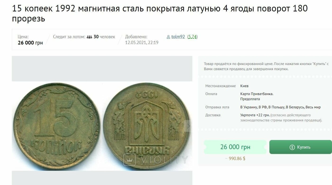 За 26 тысяч гривен можно продать монету номинала 15 копеек 5692.com.ua »