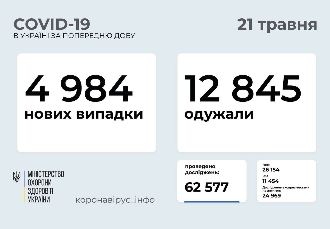 За сутки, 21 мая 2021, в Украине зафиксировано 4984 новых случаев заболеваний COVID-19. Среди них - 278 детей и 97 медработников. Об этом сообщает пресс-служба Минздрава. glavnoe.ua »