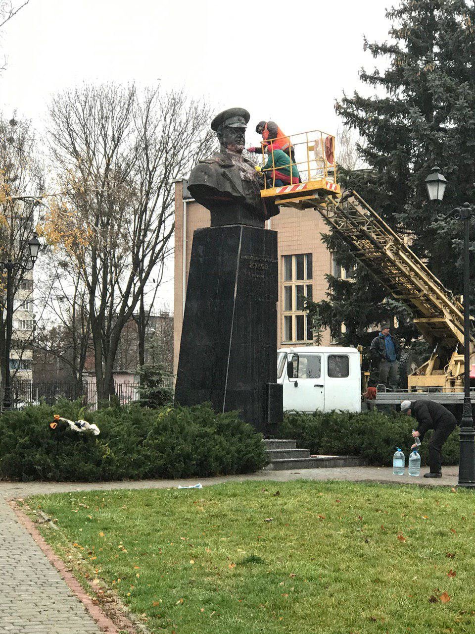 Неизвестные облили красной краской постамент, на котором стоит памятник, а у подножия написали белой краской: "Нет кровавому маршалу, мы не забудем" и дата 1968. pravda.com.ua »