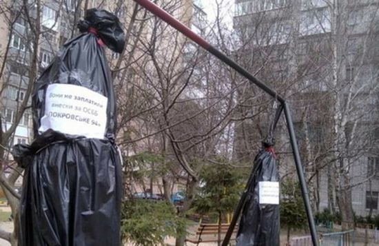 В Житомире, просто во дворе многоэтажки, на веревки подвесили пару черных мешков. И наклеили на них объявления: "Они не заплатили взносы ОСМД". Жители, которые не платят, возмутились. Зато другие, которые исправно платят квартплату, такие малогуманни намеки - поддержали. gazeta.ua »