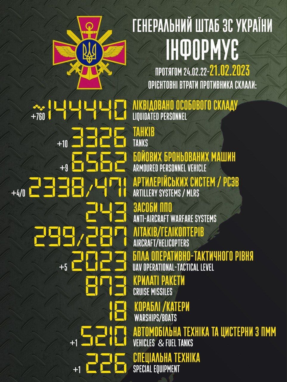 КИЇВ. 29 січня. УНН. Втрати російських окупантів з початку повномасштабного вторгнення рф в Україну сягнули вже близько 126 160 осіб, 3197 танків, 293 літаків та 284 гелікоптерів та сотень одиниць військової техніки, повідомили у Генеральному штабі ЗСУ, пише УНН. unn.com.ua »