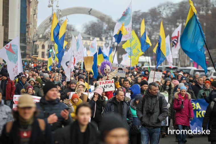 Участники протестной акции несут в руках перевернутый флаг Украины, утверждая, что именно такой флаг "правильный". focus.ua »