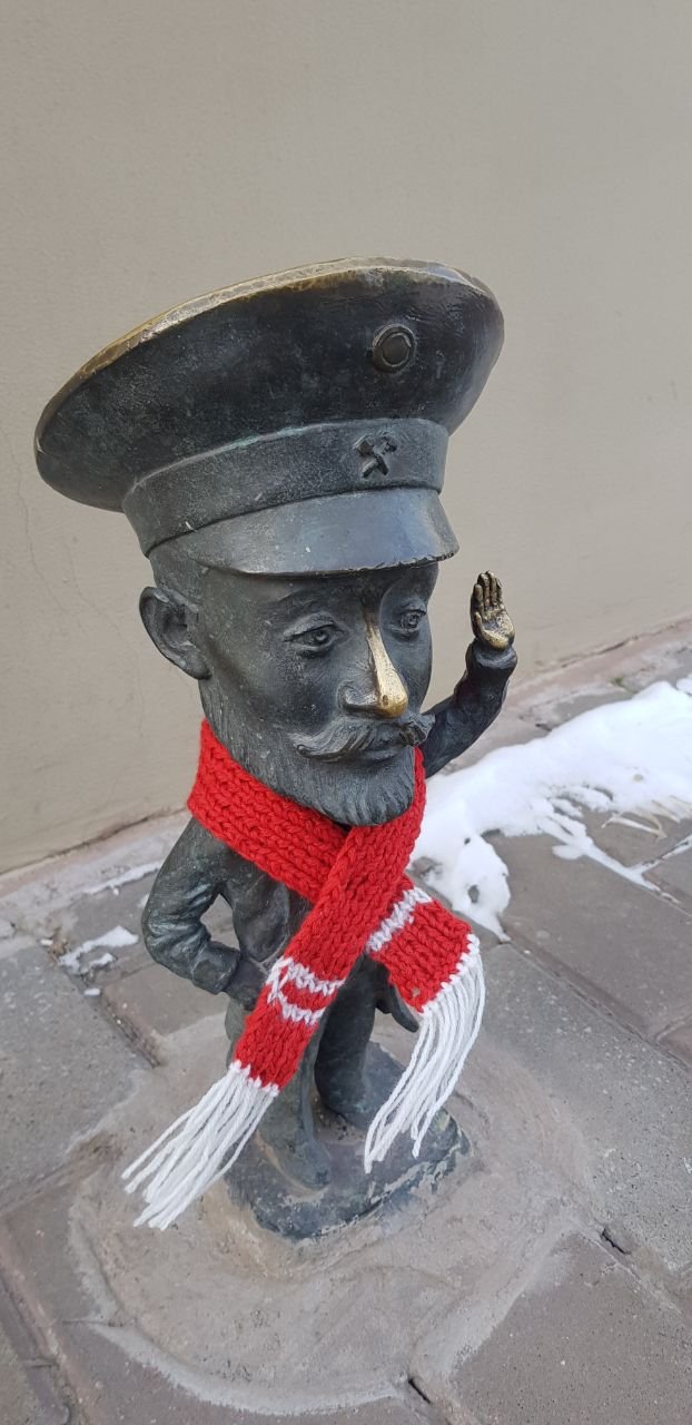 На фігурці архітектора біля Маріупольської Вежі з’явився в’язаний шарфик 0629.com.ua »
