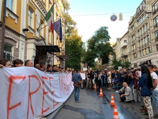 Участники акции принесли под посольство Италии пустые коробки из-под пиццы и баннер FreeMarkiv segodnya.ua »