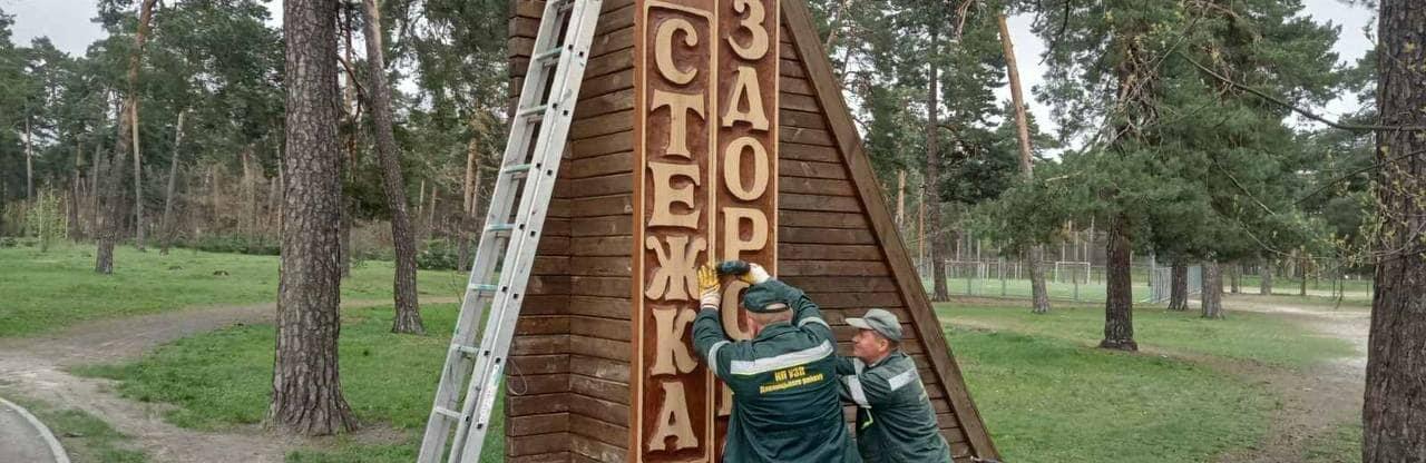 Працівники комунального підприємства замінили частину дерев'яного вказівника в столичному парку «Партизанської слави». 44.ua »