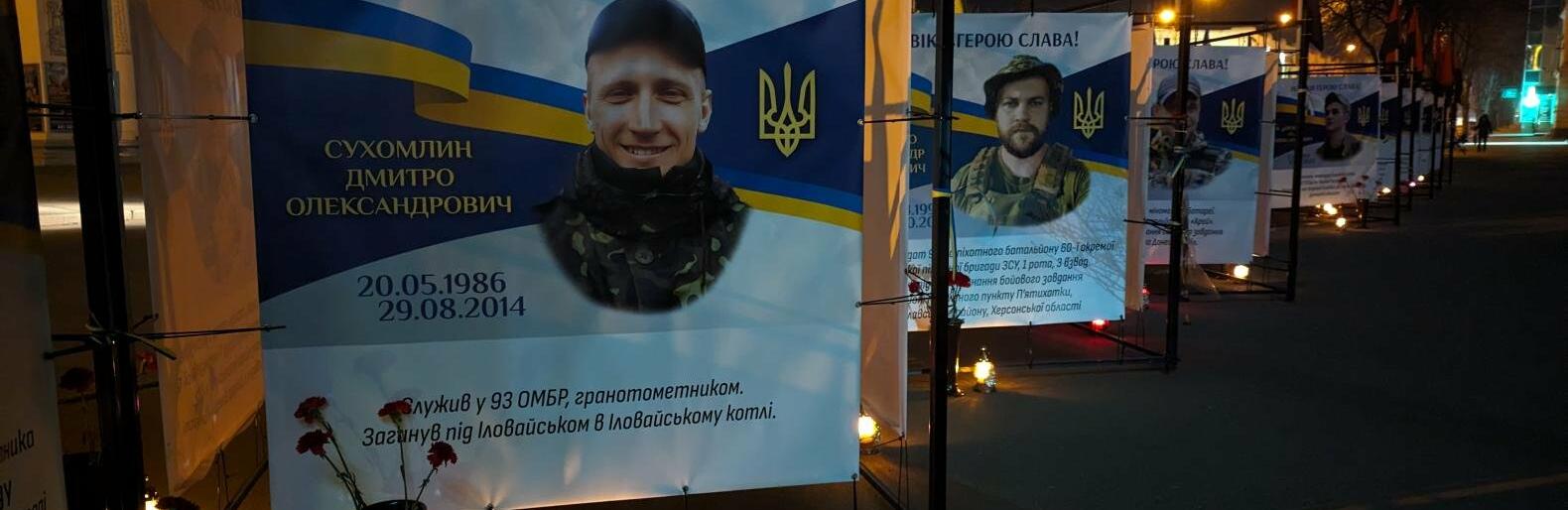 Днями біля банерів з портретами захисників були встановлені вази для квітів та лампадки. 0564.ua »
