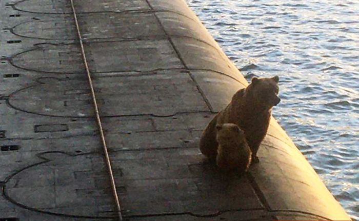 В России на базе подлодок медведица с маленьким медвежонком залезла на корпус подводной лодки. k.img.com.ua »