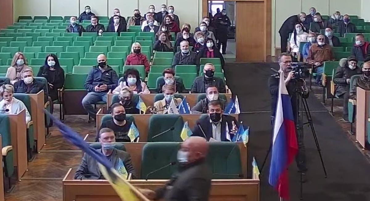 Общественный активист Василий Хоменко внес в сессионный зал флаги России и Украины, пытаясь привлечь внимание общественности к факту участия РФ в войне против Украины. dialog.ua »