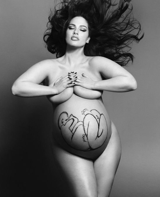 Обнаженная Эшли Грэм на последних месяцах беременности позировала с нарисованными двойняшками на животе