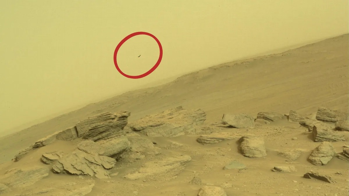 На новом снимке Perseverance виден каменистый марсианский пейзаж и кусок неба, на котором четко выделяется черная точка. focus.ua »