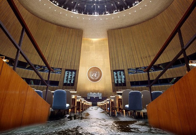 В организации до сих пор не отреагировали на подрыв российскими оккупантами Каховской ГЭС. На "поздравительной" фотографии использована иллюстрация зала Генассамблеи ООН, который якобы затопила вода. focus.ua »