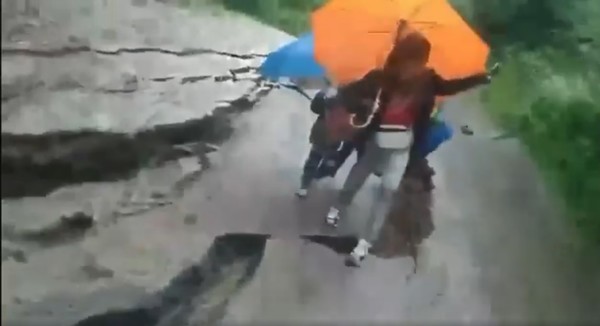 Женщина с двумя детьми прошла по растрескавшейся дороге перед ее обрушением segodnya.ua »