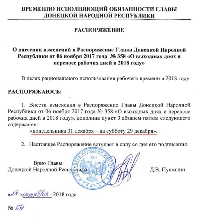 Врио Главы ДНР Денис Пушилин установил 2,3,4,5, а также 7 и 8 января 2019 года выходными днями. 06252.com.ua »