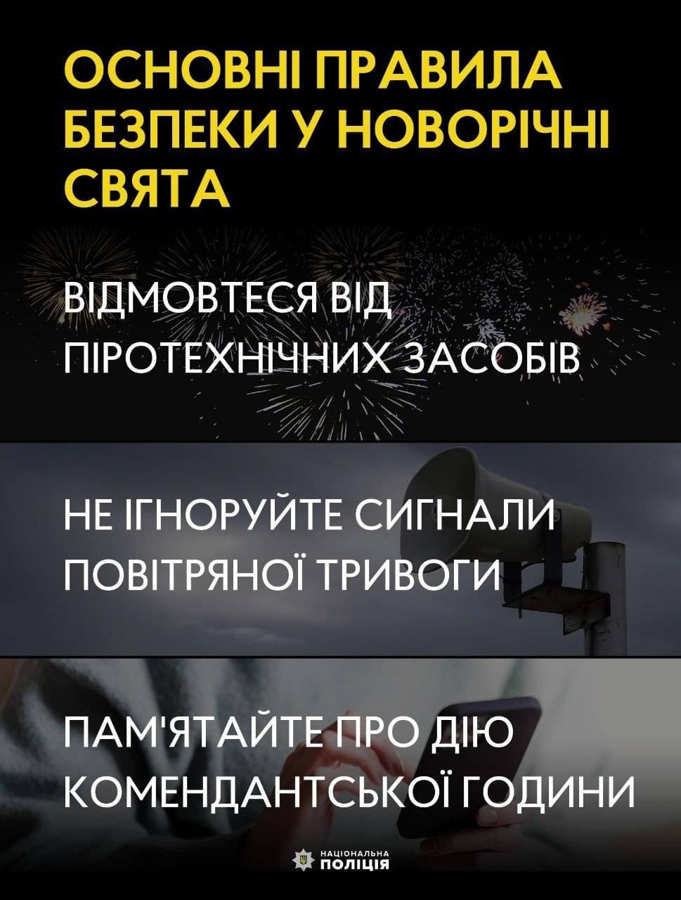 В поліції нагадують, що в новорічну ніч дія комендантської гдоини продовжиться, перебувати у громадських місцях і на вулиці заборонено. Виняток — вихід до укриття 061.ua »