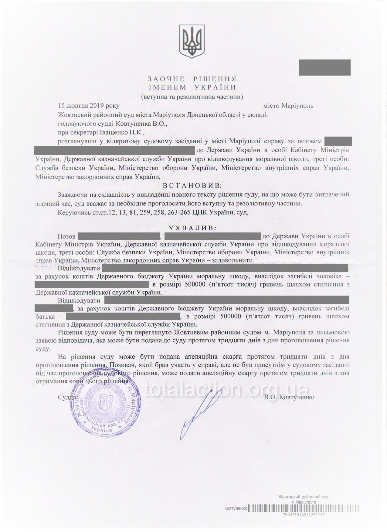 Семья из Широкино отсудила 1 млн. грн. в качестве компенсации за погибшего мужчину 0629.com.ua »