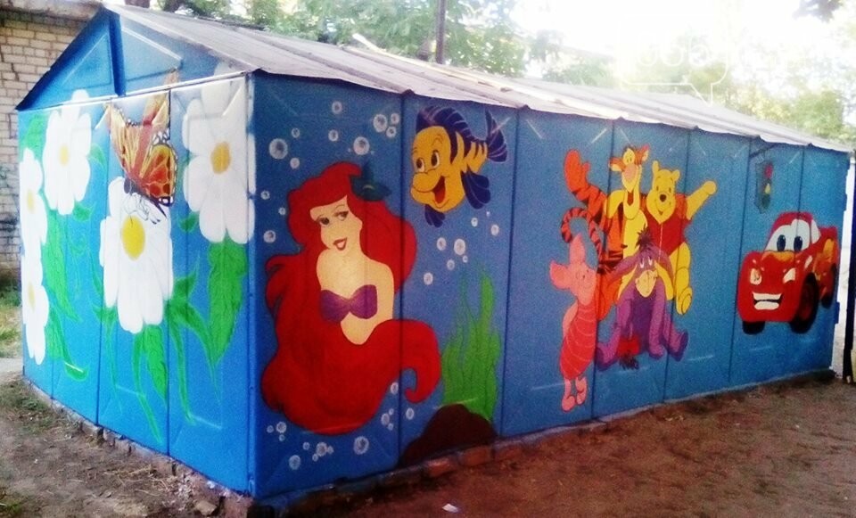 Рядом с разрисованным гаражом находится детская площадка 056.ua »