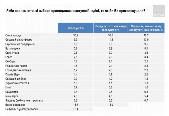 Рейтинг политических сил возглавляет партия "Слуга народа" с 42,2% поддержки, на втором месте партия "Оппозиционная платформа - За життя" - 13,5%, Европейская солидарность"третья - 9,5% 0642.ua »