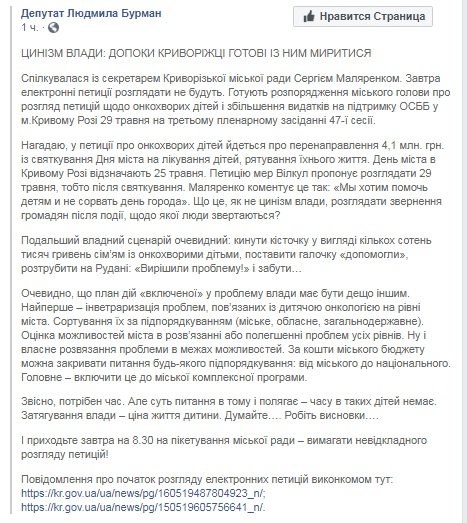 Меньше суток понадобилось криворожанам, чтобы собрать подписи под петицией с требованием перенаправить деньги с Дня города на лечение тяжело больных детей 0564.ua »