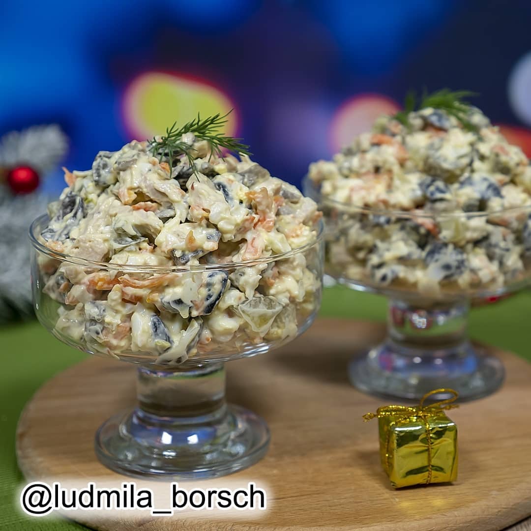 В этом салате много мяса. А пикантности ему придают маринованные грибочки. focus.ua »