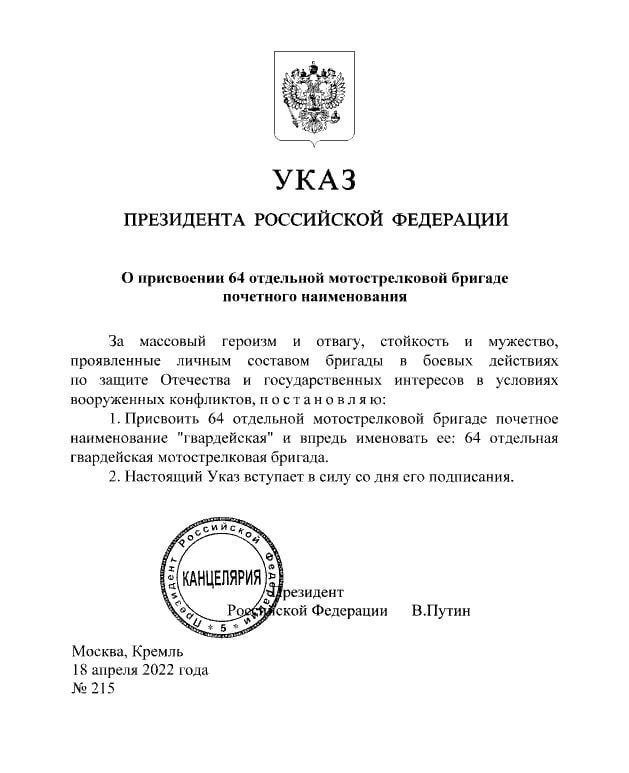 Президент Росії Володимир Путін надав 64-й бригаді почесне звання «гвардійської». Саме ця бригада влаштовувала звірства в Бучі: ґвалтували жінок і дітей, убивали цивільних та мародерствували. Відповідний указ Путіна опубліковано на порталі урядових документів. for-ua.com »