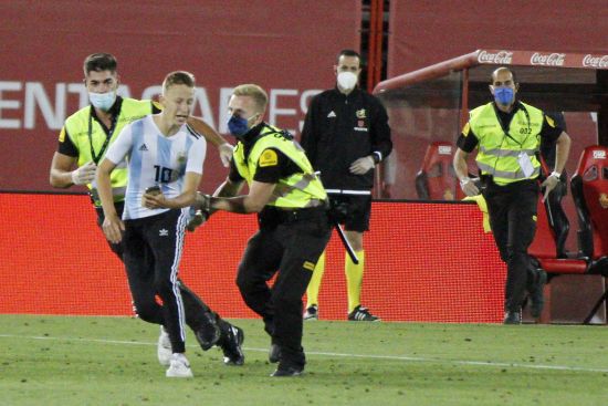 В 28 туре Ла Лиги "Мальорка" принимала "Барселону". На 53-й минуте на поле выбежал болельщик в майке в сборной Аргентины с фамилией и игровым номером форварда Лионеля Месси на спине. Фанат подбежал к своему кумиру, но его сразу поймали стюарды и вывели за пределы поля. gazeta.ua »