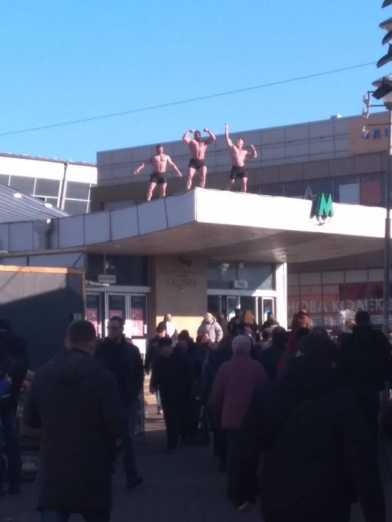 На опубликованном фото видно, что на крыше перехода, ведущего к станции метро, находились подкаченные мужчины в шортах и с голым торсом. unian.net »