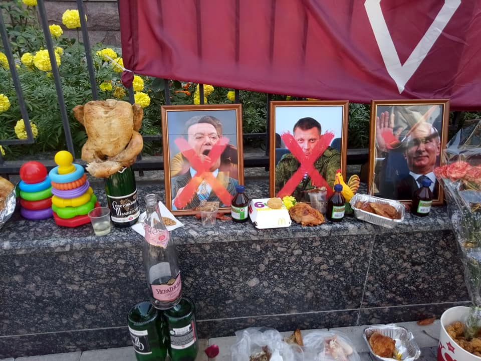 Киевляне принесли под стены посольства России жареную курицу, фаст-фуд и шампанское. Так помянули главаря ДНР Александра Захарченко и российского певца Иосифа Кобзона, который выступал против Украины и поддерживал боевиков. gazeta.ua »