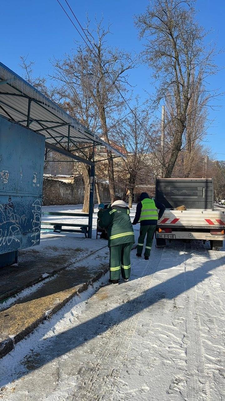 У Миколаєві з ранку посипають тротуари та зупинки: комунальники працюють у посиленому режимі, - ФОТО