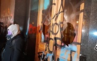 Участники акции в поддержку активиста Стерненко пытались попасть в Офис президента. Вход в здание закидали дымовыми шашками, также подожгли табличку, разбили окна, залили красной краской и разрисовали стены. k.img.com.ua »