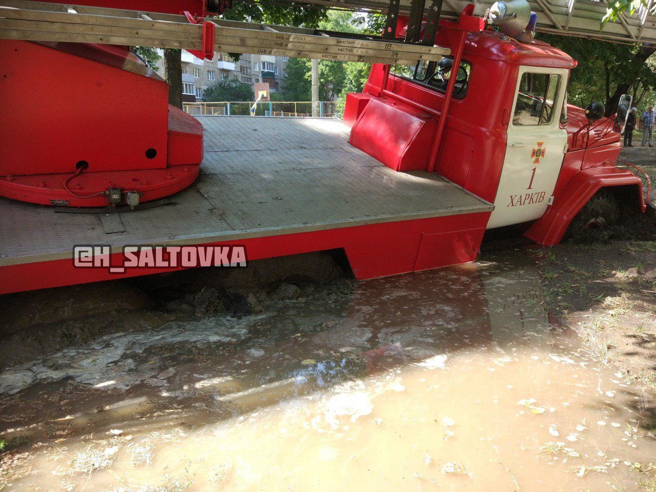 Машина с лестницей провалилась практически всей передней частью под землю 057.ua »