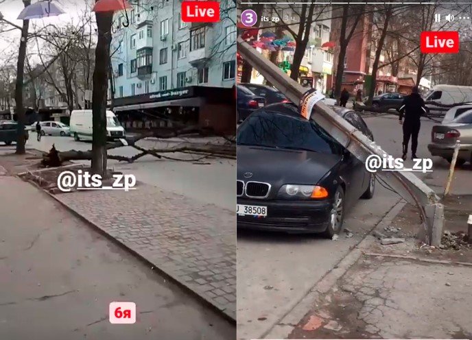 Упавшее дерево зацепило провода, из-за чего рухнула электроопора прямо на припарковнный автомобиль. 061.ua »