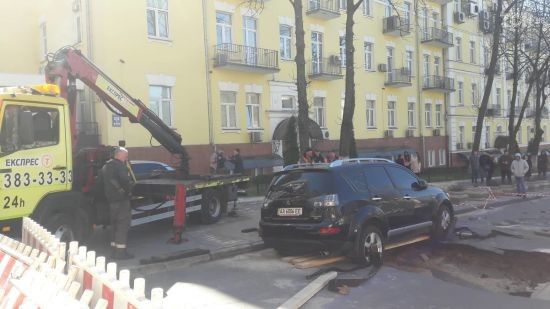 В Киеве от прорыва трубы провалился асфальт с припаркованным внедорожником