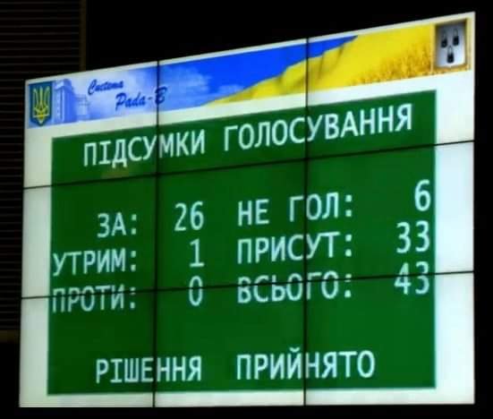 Для цього не вистачило голосів. "За" віддали голоси 14 депутатів, "проти" - жодного голосу, "утримались" - 2, 10 не голосували. Усього в залі присутні 26 депутатів з 42-х 0542.ua »