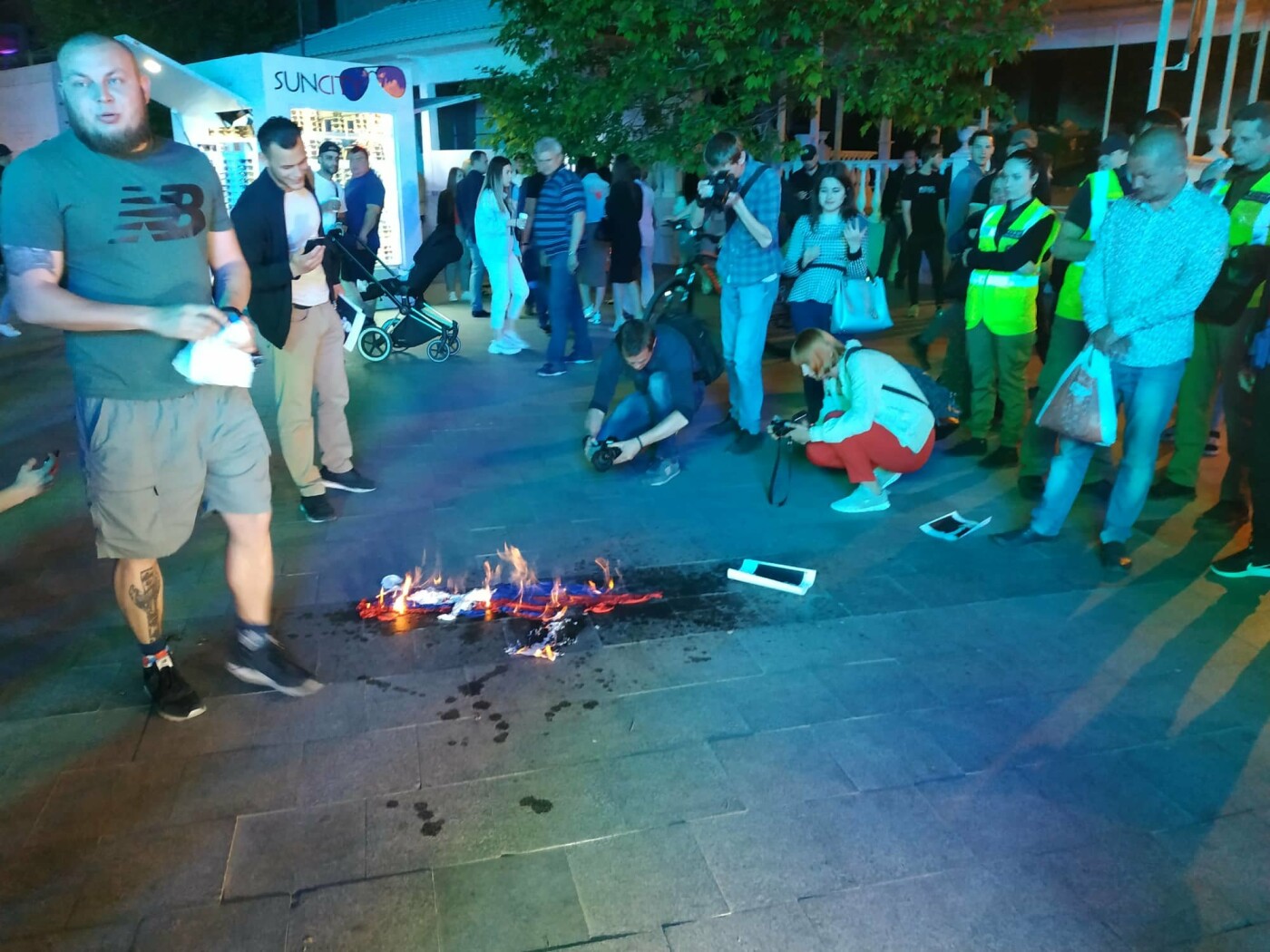 Загоревшийся флаг РФ украинки бросили на землю и вытерли об него свои ноги, выражая презрение к Российскому государству и оккупационной армии РФ. dialog.ua »