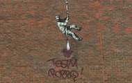 Вандалы зарисовали часть изображения бегущего из тюрьмы заключенного. При чем сделали это от имени покойного врага Бэнкси. k.img.com.ua »